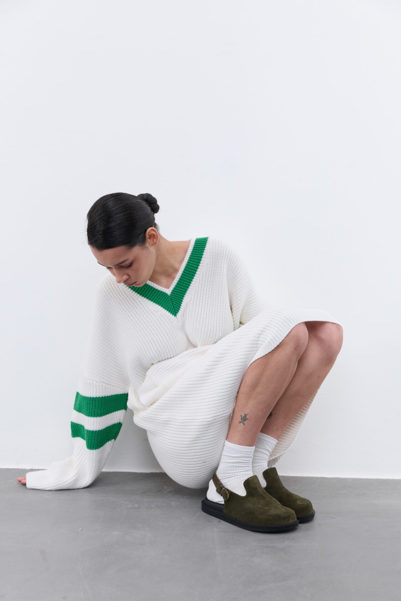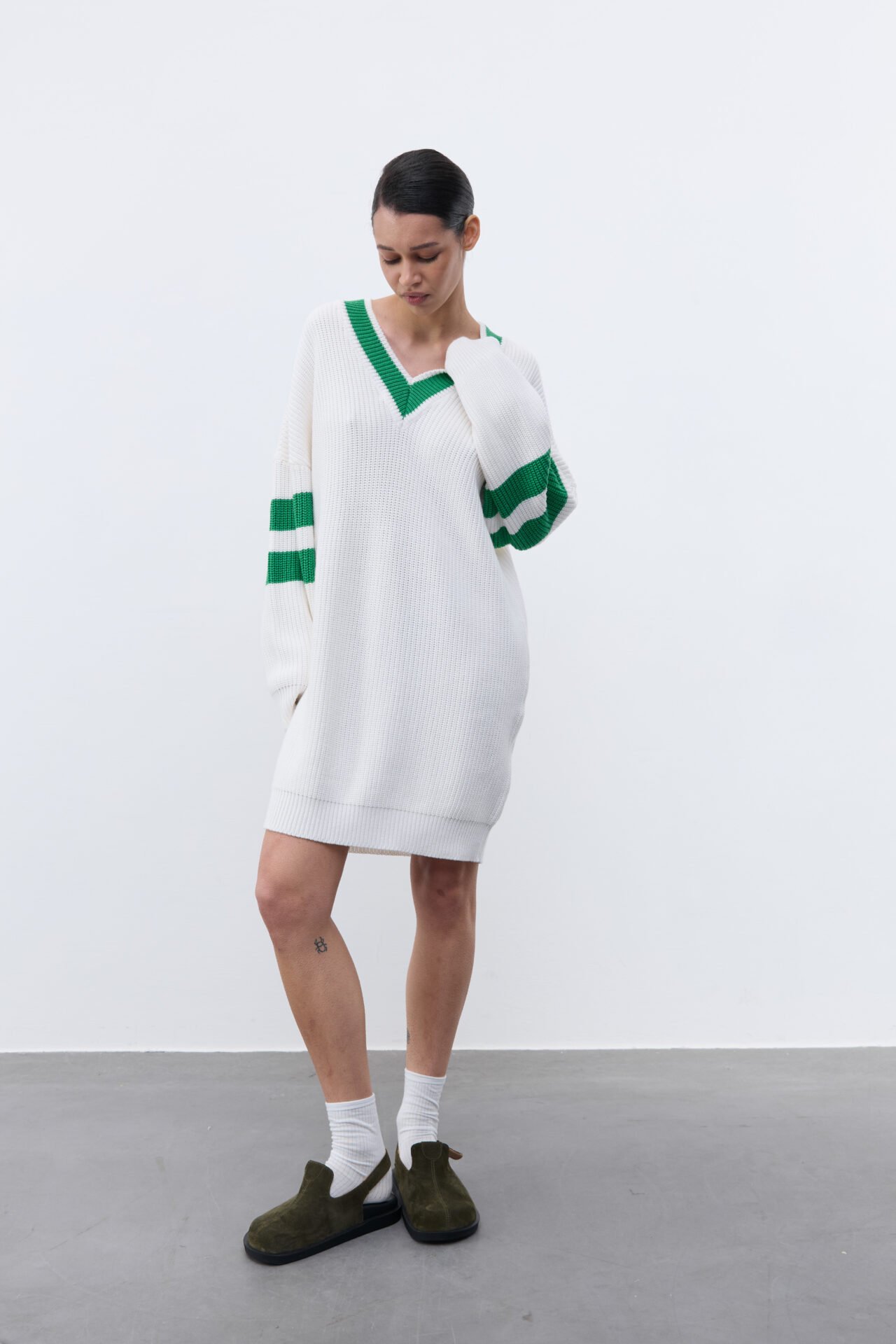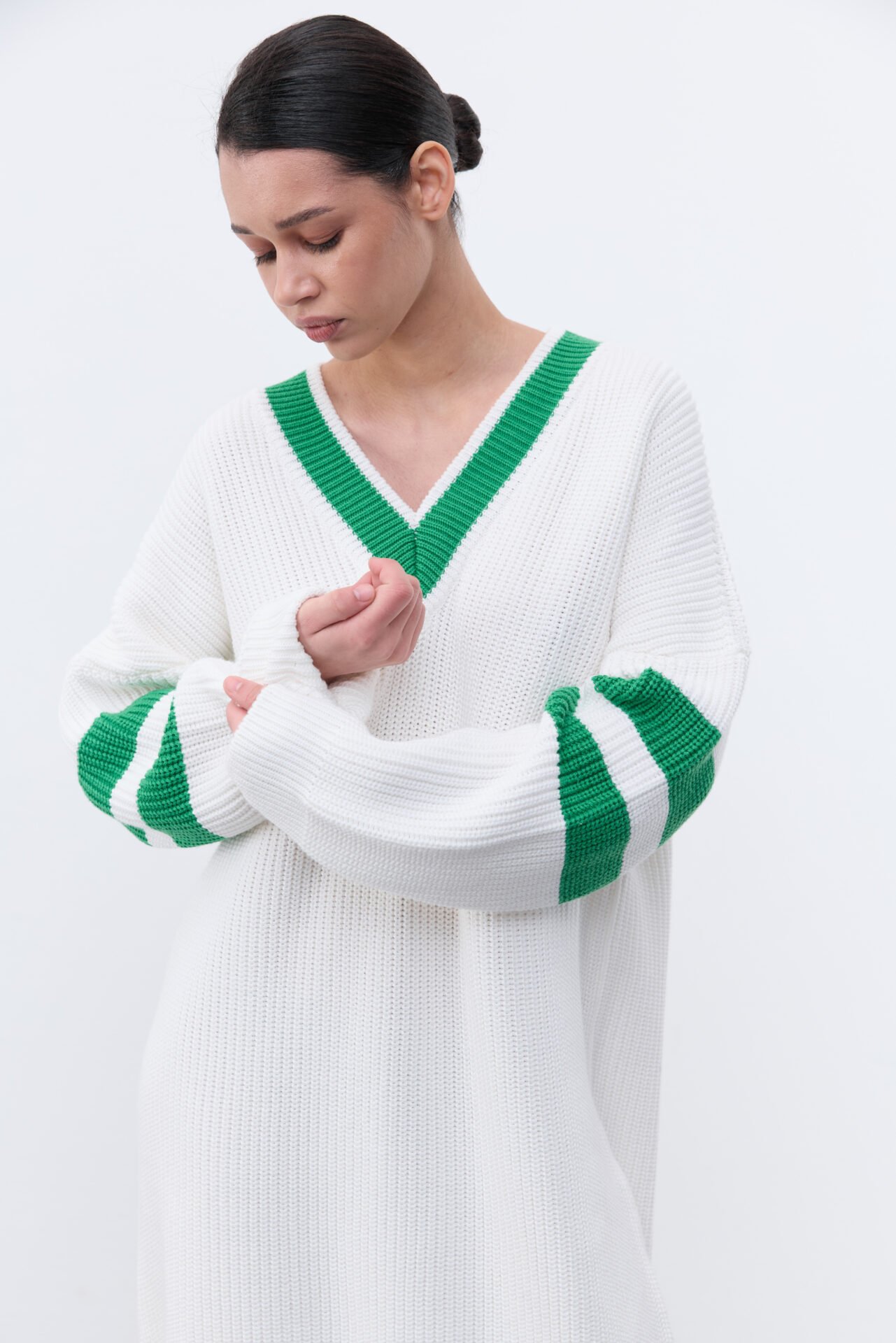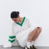 Джемпер вільного крою з натуральної пряжі виконаний в масивній англійській вʼязці. Радимо стилізувати виріб із високими панчохами , чоботами або клогами.