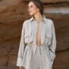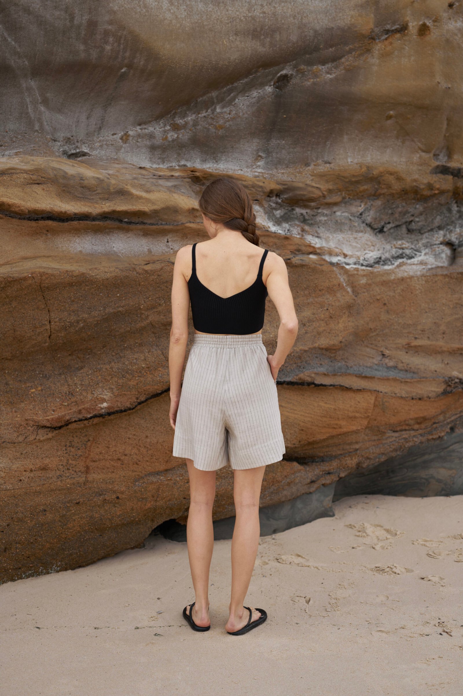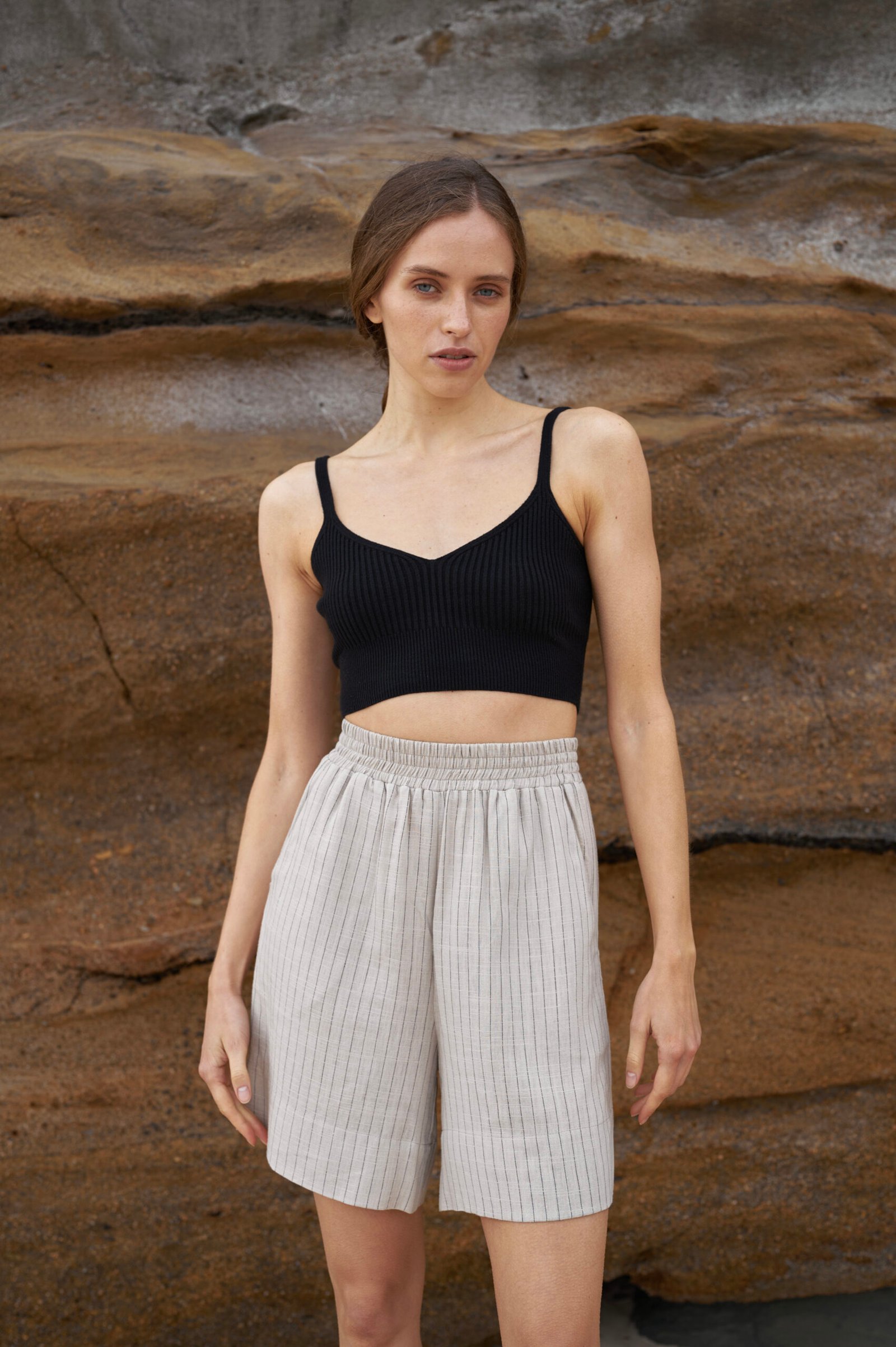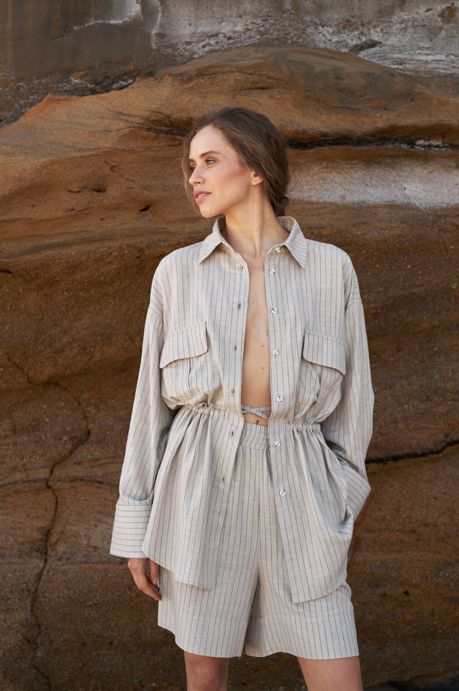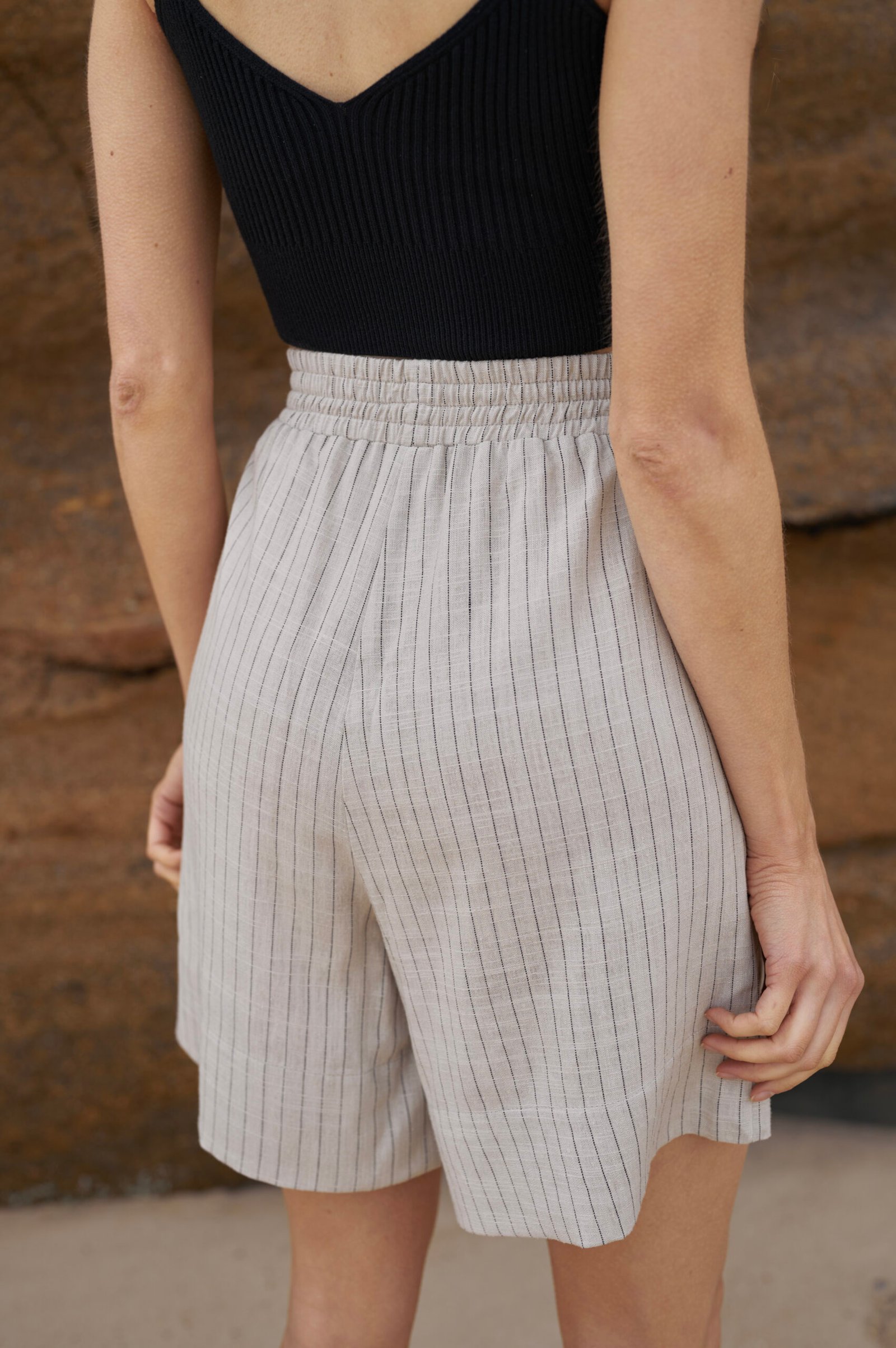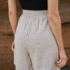 Шорти високої посадки з натурального легкого матеріалу – льон-віскоза. Шорти мають високу посадку, середню довжину та комфортні внутрішні кишені. На відміну від звичайного льону, льон-віскоза мʼякший та приємніший на дотик матеріал , а також менше мнеться.