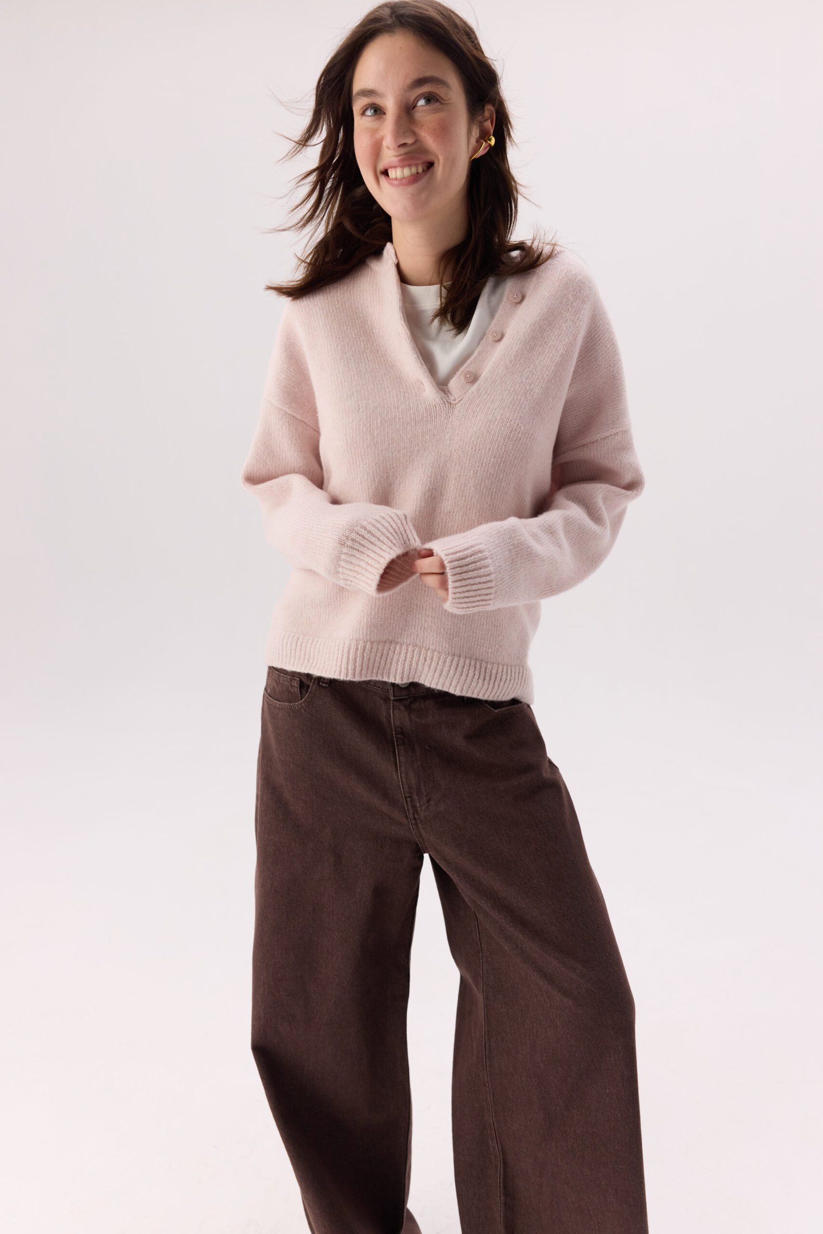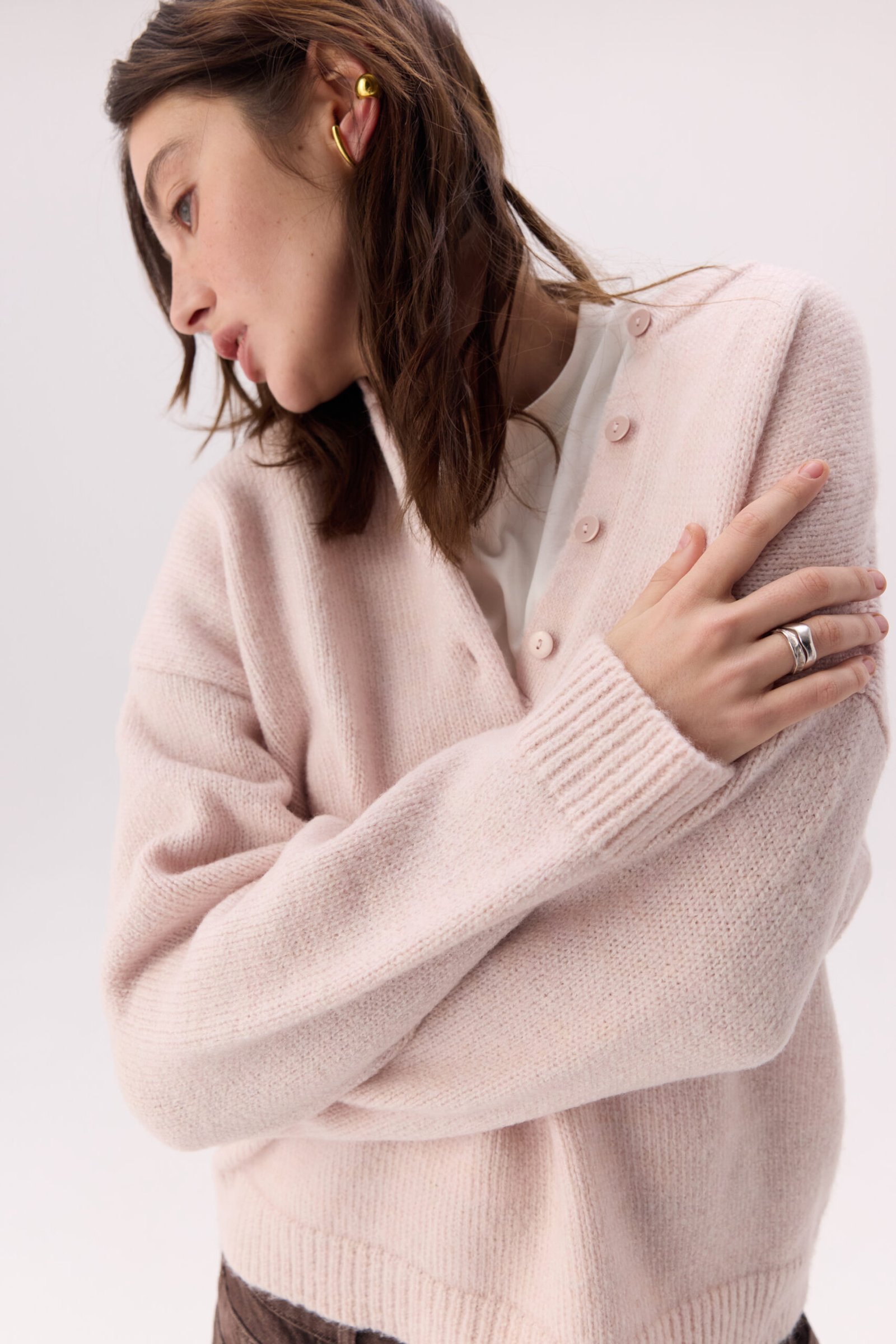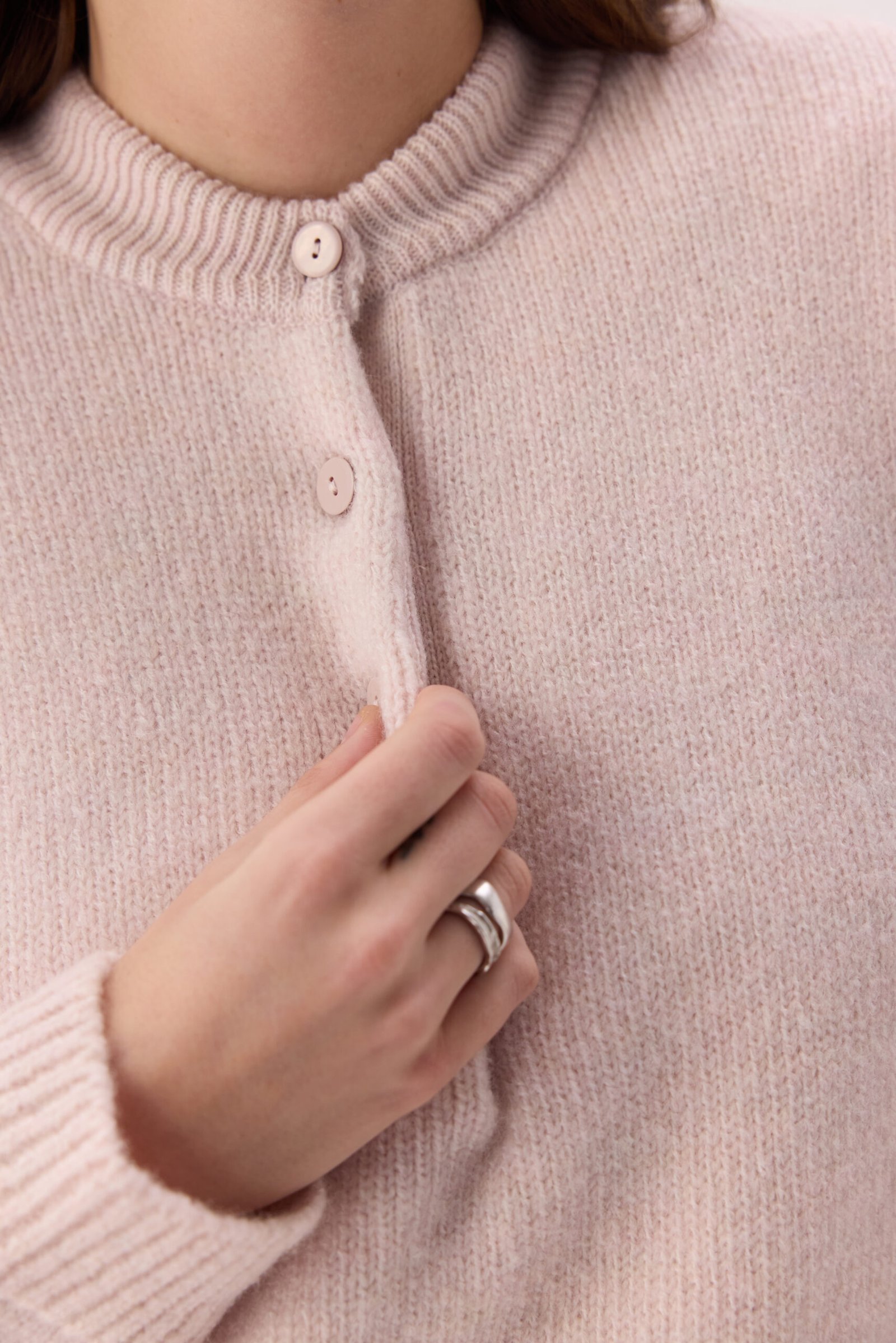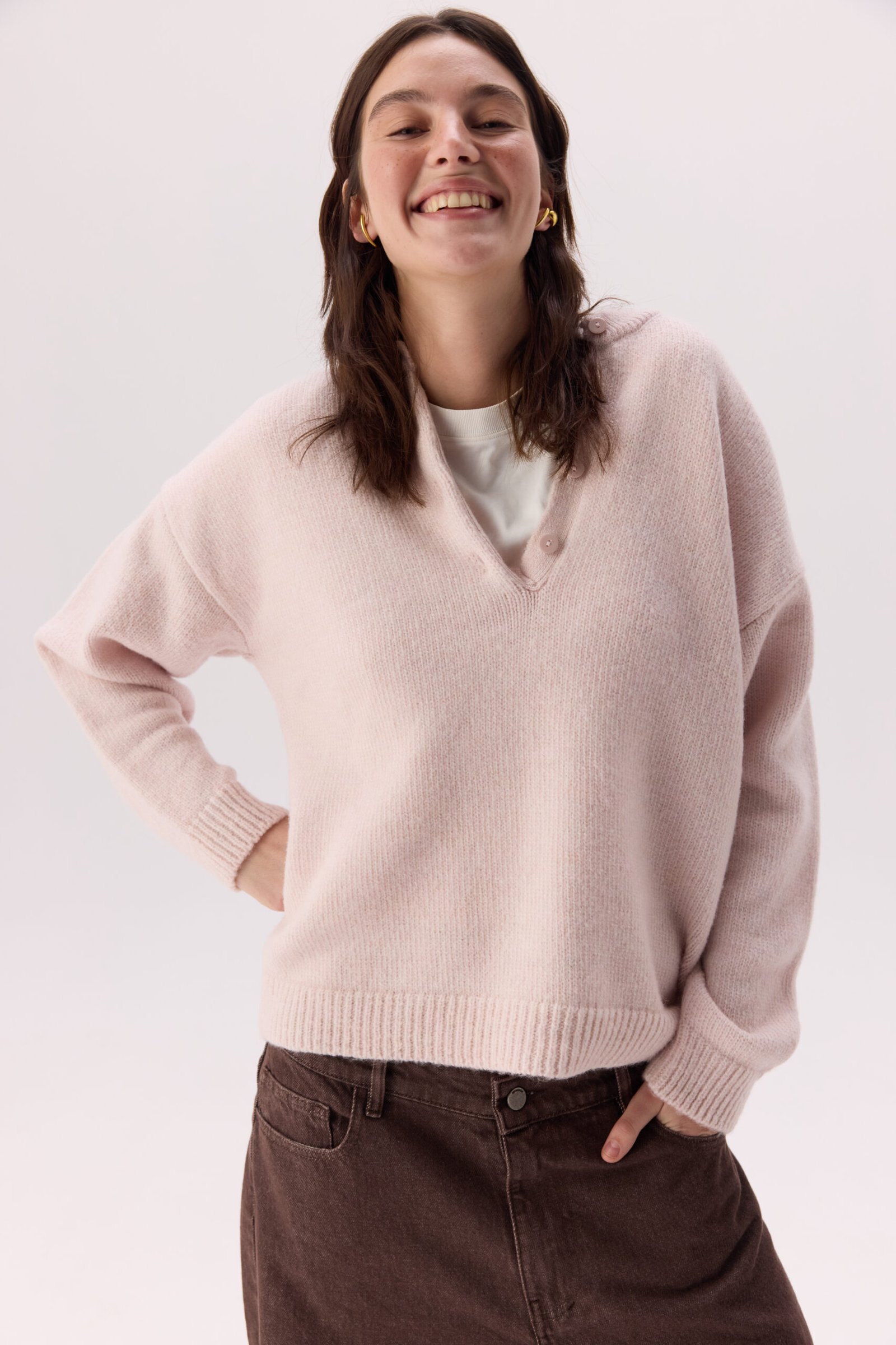 Светр “Merino” виготовлений з натуральної пряжі, що забезпечує м’якість, тепло та комфорт у носінні. Виріб має легку ворсисту текстуру, приємний до тіла та добре утримує тепло. Головним акцентом моделі є функціональна горловина на ґудзиках, яка дозволяє легко стилізувати светр і поєднувати його в багатошарових образах.