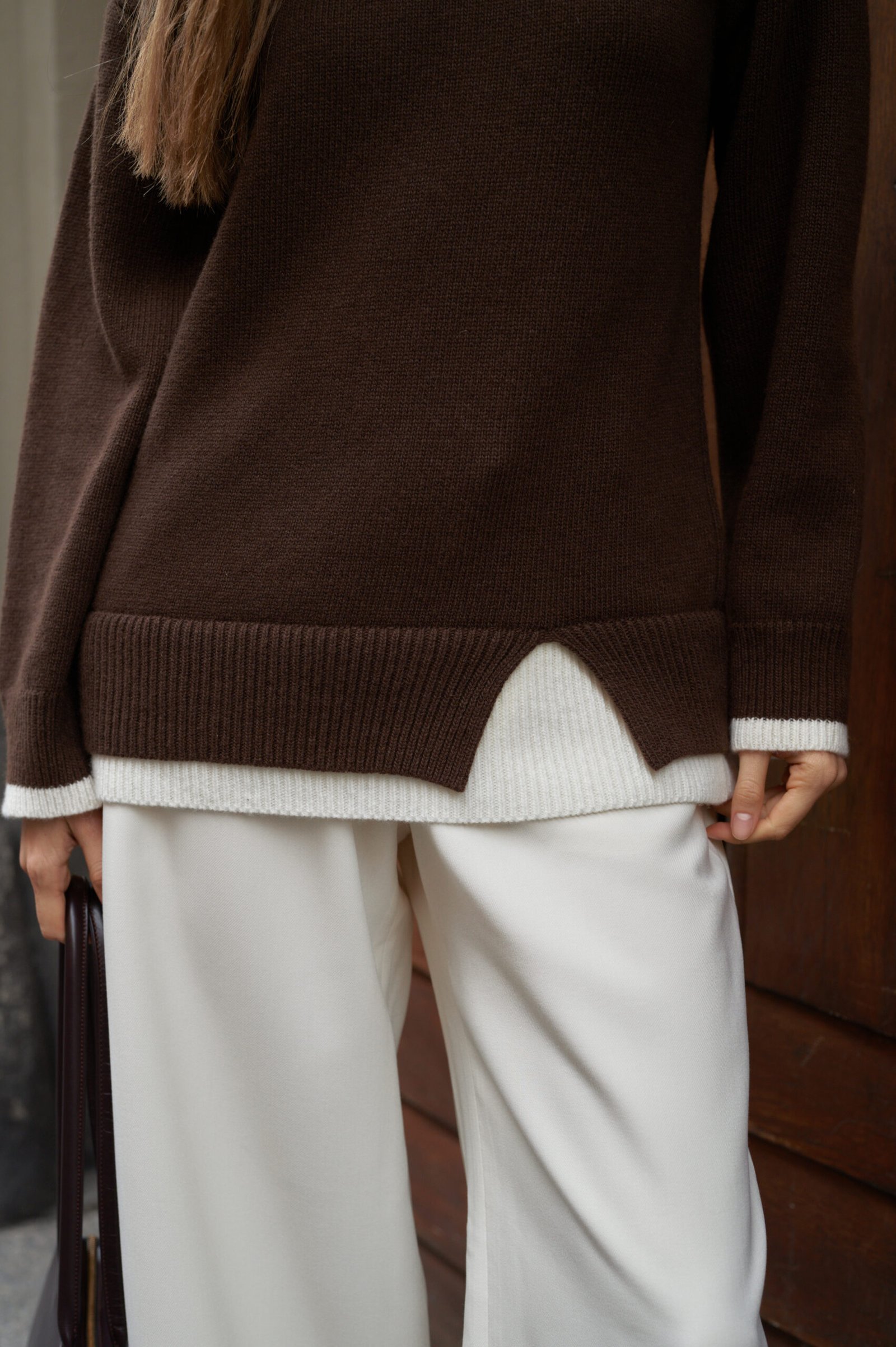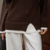 Світшот вільного крою з імітацією багатошаровості та акцентним розрізом. Контрастна біла вставка на горловині, рукавах та по нижньому краю створює ефект одягненого під низ лонгсліва, що додає образу структурованої завершеності.